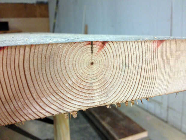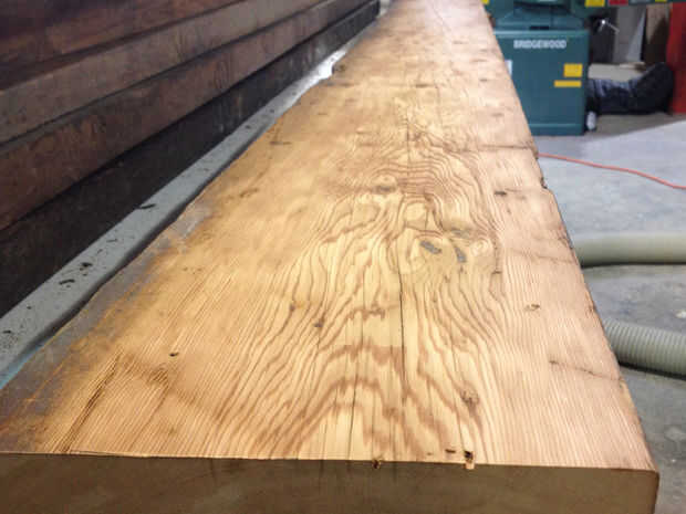 Por debajo de todo ese aceite suciedad y calefacción estaba hermosa, rayadas, de color rojizo Douglas Fir. Cualquier madera terminas usando el proceso es de aproximadamente el mismo. Para limpiar, cortar en longitudes de 8', luego ejecutarlo a través de la cepilladora hasta que sea un uniforme 1-1/4" densamente.