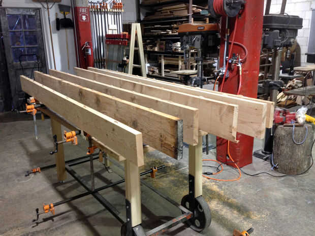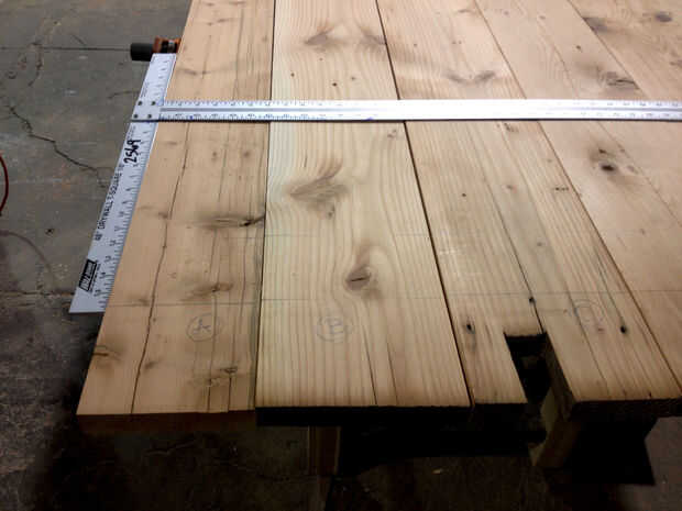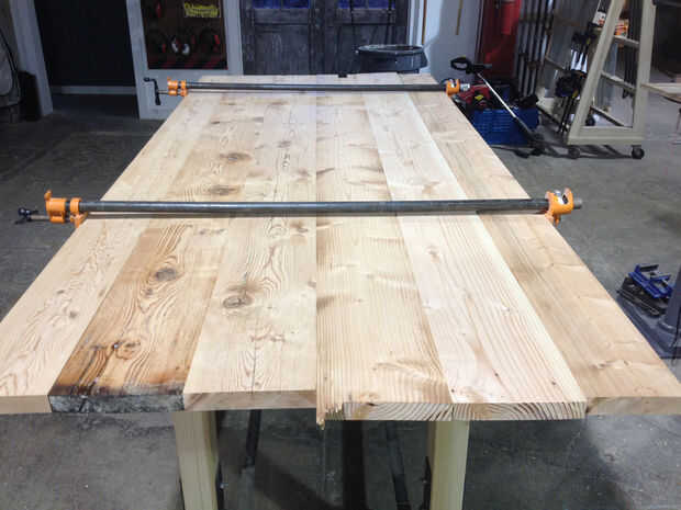 Coloque todos lo tableros por lado en una mesa de trabajo sobre cauls (soportes en forma de T hechos de 2x4s que mantenga la superficie elevada para sujeción). Puzzle las tablas alrededor hasta que se ajustan razonablemente bien juntos cuando se presiona con la mano y tienen alternando veta--en una junta el grano debe "smile," en el siguiente debe "fruncir el ceño" y así sucesivamente. Cuando esté satisfecho con el arreglo de los tableros, uso dos abrazaderas para secar ligeramente que encajen y ver si hay lagunas. Las juntas deben cerrar firmemente unos a otros con un mínimo de presión.