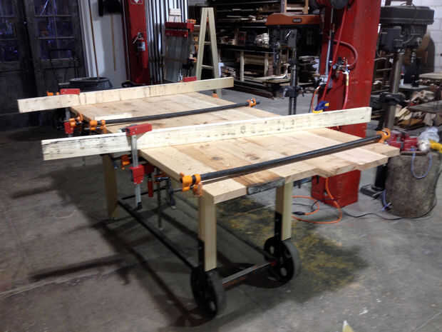 Debe comenzar la Asamblea ahuecamiento, sujete un transversal de 2 x 4 a la mesa para aplanar hacia fuera.