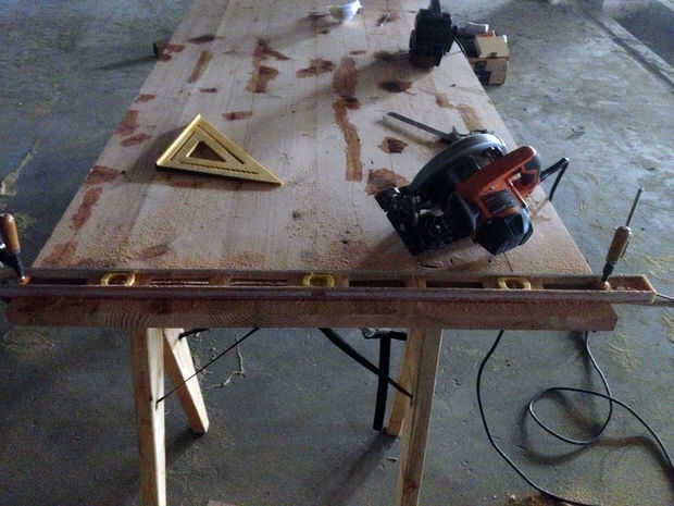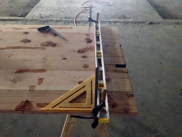 Cuadrada de los extremos de la tabla por sujeción a una regla, en este caso un nivel--y correr una sierra circular con hoja de acabado en los extremos. Recuerde que debe mantener para compensar la medida por la distancia desde el borde de la placa base a la cara de la hoja.