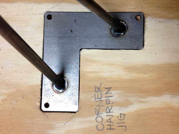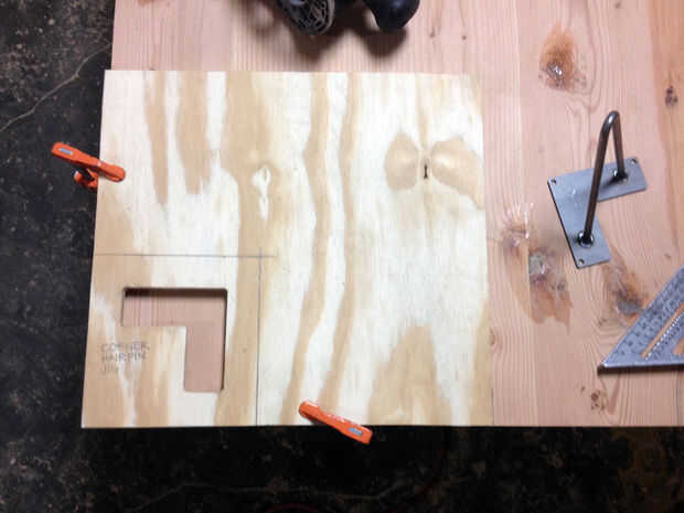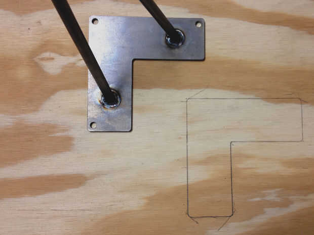 En primer lugar, conseguir un trozo de madera contrachapada de 1/2". Trazar la porción en forma de L de la horquilla en la madera, luego corte con un taladro y una sierra de calar. De la abrazadera hacia abajo hasta un trozo de madera y utiliza un router con un poco de tapa de cojinete para cortar una ranura profunda prueba de 1/4". Una vez que el router está correctamente calibrado, fijarlo con la abrazadera en una esquina de la mesa, para que los extremos de la "L" son cada 3" en cada borde y Plaza a cada lado. El codo de la "L" debe apuntar hacia el centro de la mesa. La derrota de la hendidura. Repetir en cada esquina. Limpiar las esquinas con un cincel según sea necesario.
