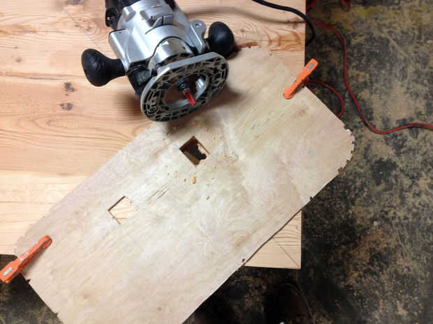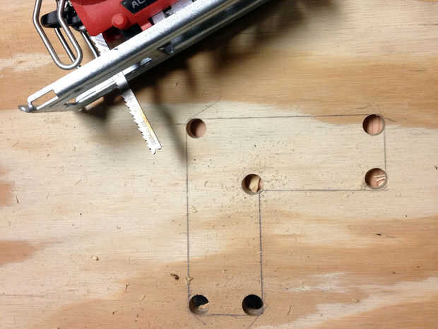 Hacer un segundo jig de 1/2" madera contrachapada que es 1-1/4" por 1-1/4". Use un taladro y una sierra de calar para recortar la mayoría de cada mortaja, permanecer dentro de las líneas. Colocar cinta de pintor en la parte inferior (la parte de superior futuro) para evitar que arranque. Utilice el router y la plantilla para la mortaja a su dimensión final. Limpiar con un cincel.