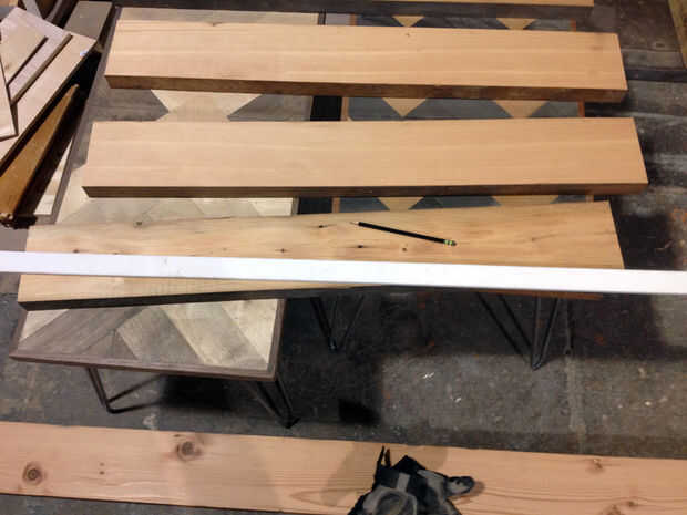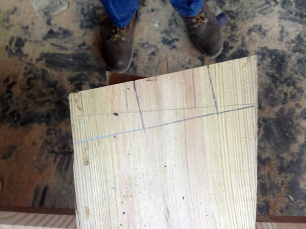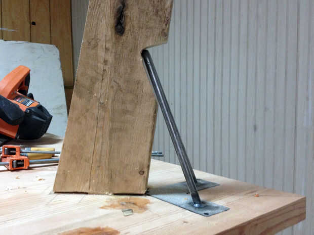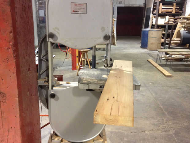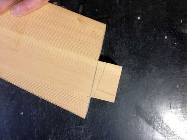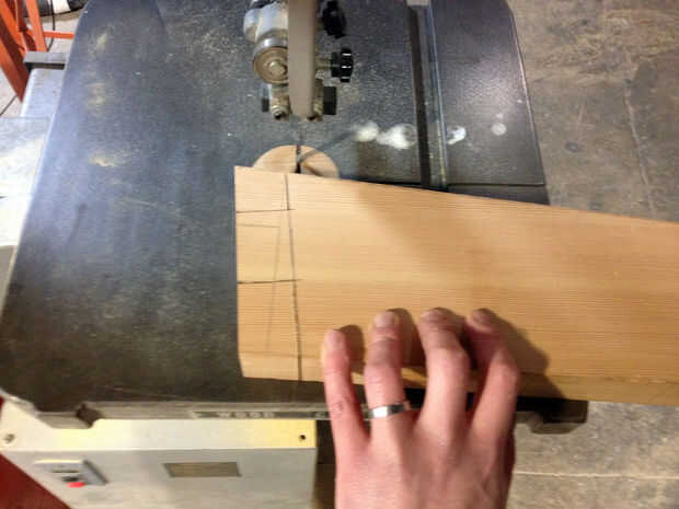 ESTO LE LLEVARÁ ALGÚN ENSAYO Y ERROR. Probó mi paciencia, seguro; puede llevar muchos intentos para obtener la ranura de la horquilla calibrada. Una vez que se ajusta a la pierna y acepta la horquilla correctamente, cortar cuatro chapas de abeto Douglas en 5-1/2" de ancho y 36" de largo, con ingletes de 8 grado paralelo. Use una sierra de cinta para cada uno y una juntera para aplanar los cortes de Sierra de cinta de la forma cónica. Sierra de cinta hacia fuera de la espiga y la ranura de la horquilla.