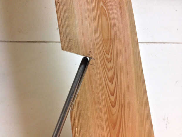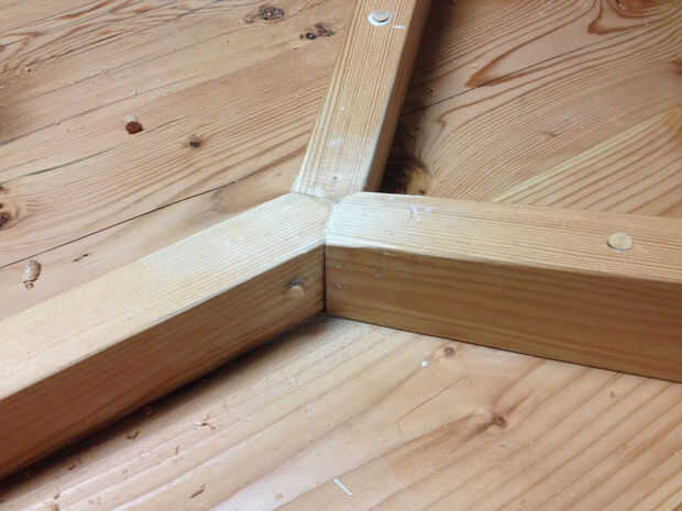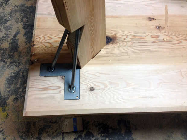 Con el travesaño en el lugar, las piernas pueden estar Unidas. Tornillo de la pata de la horquilla en su lugar sin apretar los tornillos absolutamente todo el camino. La espiga de la pierna con el pegamento de la capa y pulse en su lugar con un mazo. Una vez que ambos estén bien sentados, apriete los tornillos de la pata de la horquilla y asegúrela a la pata de palo con una grapa de esgrima. Llenar los vacíos en la mortaja y espiga con el epoxy sobrante. Repita para cada pierna.