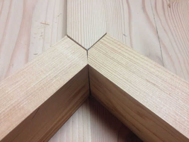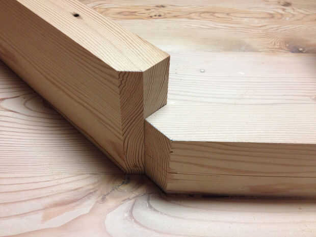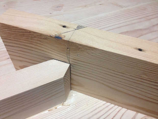 Las piernas están vinculadas a la barra con una pieza de refuerzo inclinado. Comenzar con un pedazo ancho 5" 1-1/4" de espesor. Marque el ángulo de la pierna y corte de la tronzadora. Coloque el extremo cortado contra la pierna y marcar el otro extremo donde golpea el travesaño. Cortar con un ángulo de 45 grados por lo que cumple con el extremo de la barra transversal. Dry-fit para asegurarse de que la longitud es correcta. Forma cónica de la pieza de 5" al final de la pierna a la altura de la barra transversal en el otro extremo con una sierra de cinta o de vaivén. Repita para las otras tres patas.