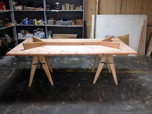 Encolar y atornillar las piezas de cuatro refuerzo. Un extremo del dedo del pie-tornillo en la pierna y uno de los extremos en la barra transversal, con dos tornillos en el medio en la parte superior de la tabla. En el fregadero y los orificios del enchufe.