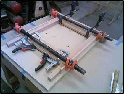 Abrazaderas de las esquinas (flechas) se utilizan para asegurar que el conjunto es cuadrado.