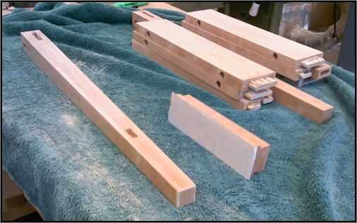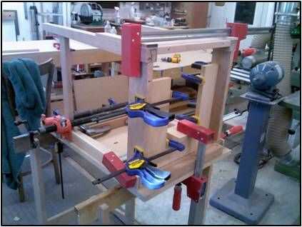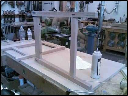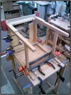 Un jig pegado ayuda a asegurar que el subconjunto de lado es cuadrado y que constantemente se colocan el delantal y camillas. Calas son conectados a una base MDF y colocados para el delantal y camillas.