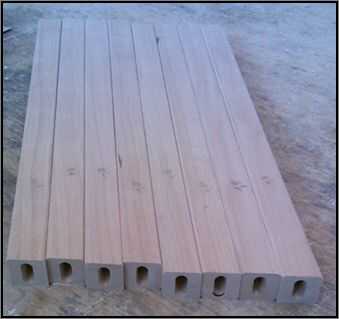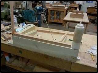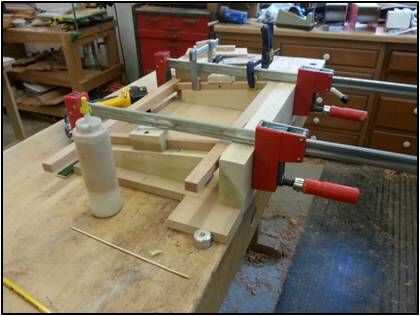 El ángulo de 7 grados hace más difícil el pegamento-para arriba para que una pegado plantilla es necesaria para asegurar que la pata de la mesa anidación asambleas son pegados cuadrado y que las articulaciones se sujetan firmemente. grado 7 rampas están hechas para sostener los separadores en el ángulo correcto. La pierna se ajusta a la guía de las plantillas.