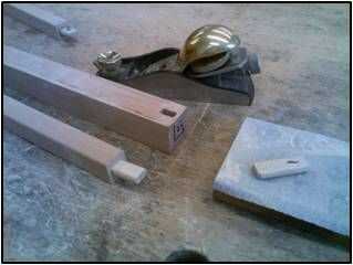 Una espiga floja se pega en los extremos de los tirantes. Dejar las espigas un poco largo. Después de que el pegamento se seca, cortar las espigas para caber las mortajas en las piernas.