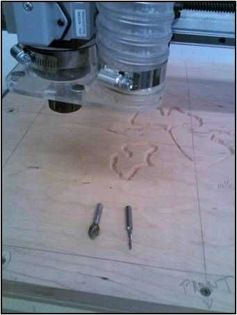 Un pedacito de v de 90 grados y un molino de extremo de corte hasta 1/8" poco fue utilizada para tallar la incrustación. El bit de "V" fue utilizado primero y luego el 1/8 final molino para limpiar el área plana.