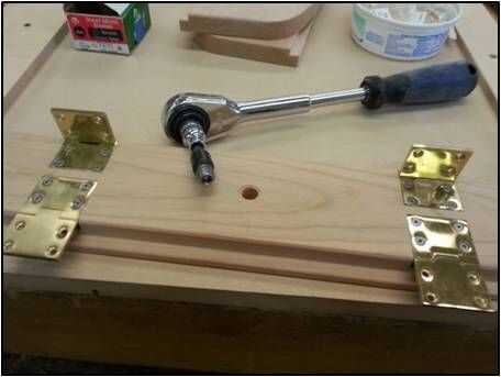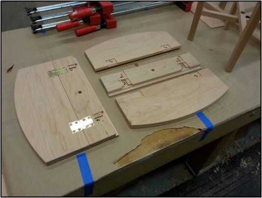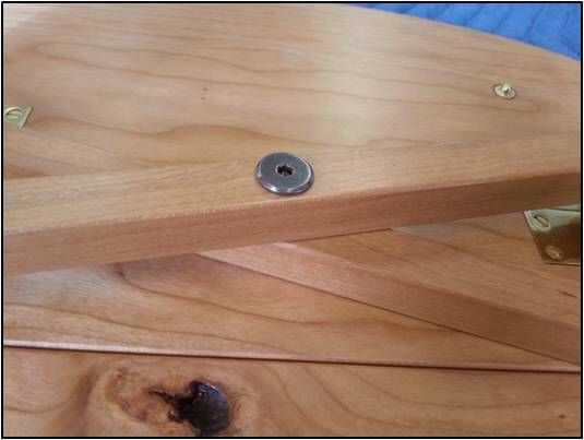 Las patas de la mesa anidan juntos tijera plegada. Los tornillos de cabeza plana son ¼ "x 20 TPI. El perno para los tornillos de arriba en una rosca inserta en panel central de la tapa.