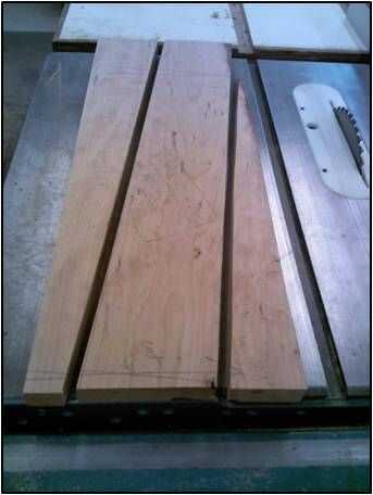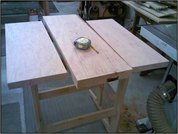 Para las dos mesas plegables seleccioné un pedazo altamente adornado de madera gruesa de 2". Utilicé la cinta y volver a aserrar la madera para hacer las tapas de dos tablas.