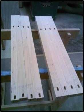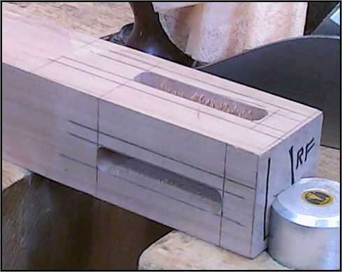 Las mortajas de los delantales y camillas para la mesa principal son 3/8" ancho y ¾" profundo. ¼" para arriba-corte final molino pedacito se utiliza para cortar.