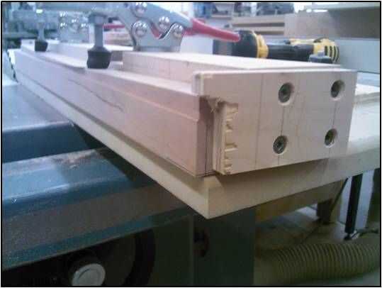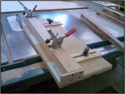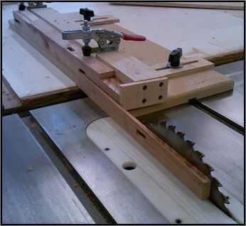 La pierna formas cónicas son cortados en la mesa vio usando una plantilla. La plantilla de paseos en la ranura de la mesa Sierra inglete y está alineada con la hoja de Sierra de mesa. Palanca de sujeción asegurar la pata en la plantilla.