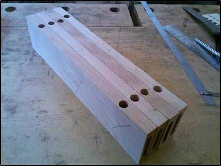 Los agujeros de montaje para el faldón delantero se colocan 1 ½" de los extremos. Eventualmente se cortará en dos piezas cortas. Desde el faldón delantero era molido y empotrado junto con los otros delantales, también era más fácil cortar los agujeros en el delantal de cuerpo entero.