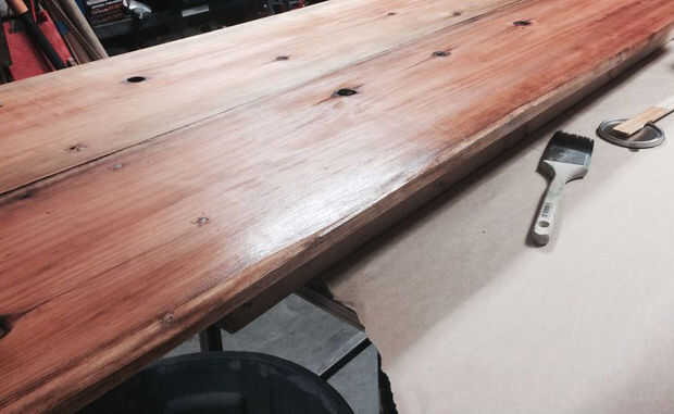 Su mesa de arena y aplicar barniz a gusto. Yo bastante enarenada apagado para deshacerse de los bits splintery y luego aplica dos capas de poliuretano brillante de semi.