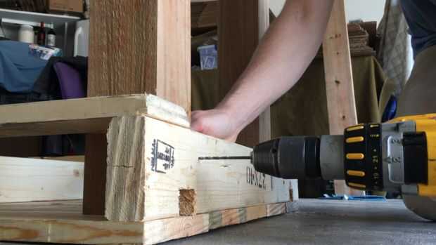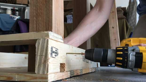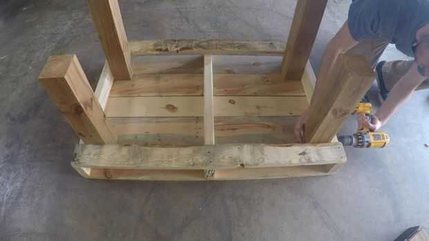 La plataforma la vuelta boca abajo y coloque una 18" 4"x 4"en cada esquina. Atornille por lo menos dos tornillos de 2 1/2" a través de la 2" x 4" cada patas 4" x 4". Asegúrese de que usted está usando tornillos al aire libre aherrumbrarán apagado.
