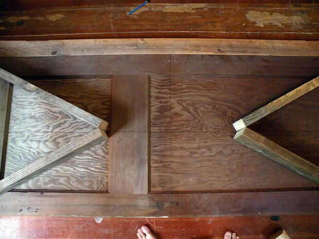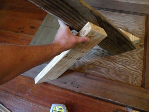 Hacer lo mismo con las llaves de pierna--solo sostener un trozo de 2 "x 4" corte ingletes ásperos, cortó uno y rastrear en las otras cuatro. Las piernas todavía ser bastante inestable y flexible en este punto, así que empuje y tire de ellas según sea necesario para hacer que se alinean con las esquinas de la mesa. Tornillo de dedo del pie y pegar los soportes con tornillos de 3", la perforación para evitar que se resquebraje.
