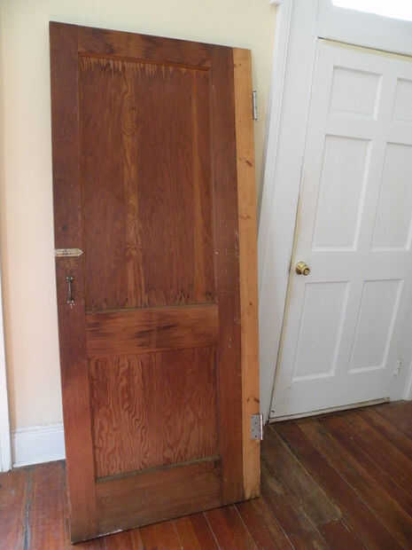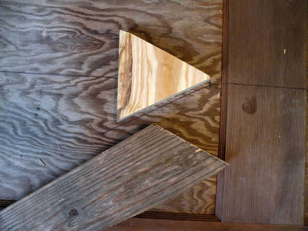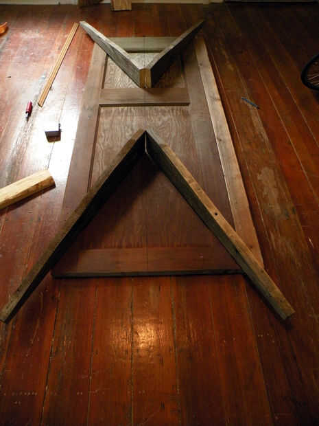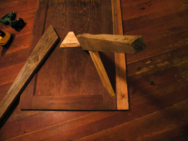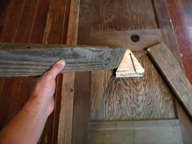 Luego poner en la puerta de su punto de fijación a las esquinas de la puerta y golpear una línea en el bajo lado de la puerta. Ahora que has creado un triángulo desde la línea central de 1/4 hacia fuera en las esquinas de la puerta. Medir el ángulo del vértice del triángulo y utilice para cortar dos triángulos de desecho de 2 "x 6". Estos serán los puntos de sujeción para las piernas. Enroscar y pegar en la puerta de la parte superior, una perforación previa con un 1/8" de bits para evitar que se resquebraje.