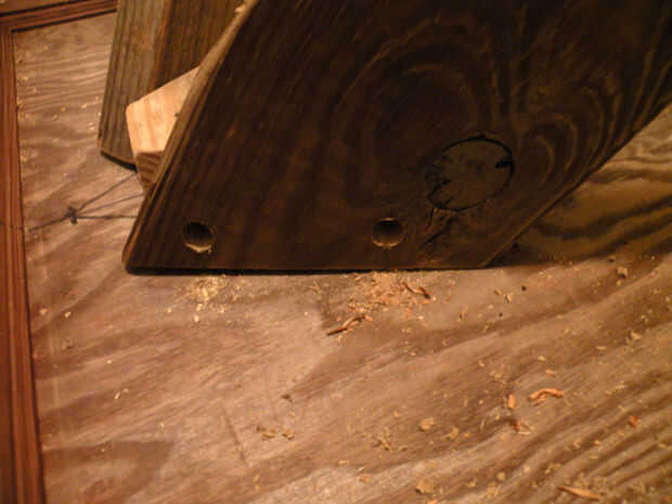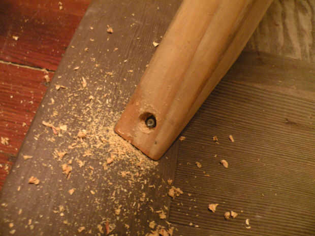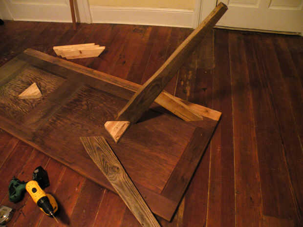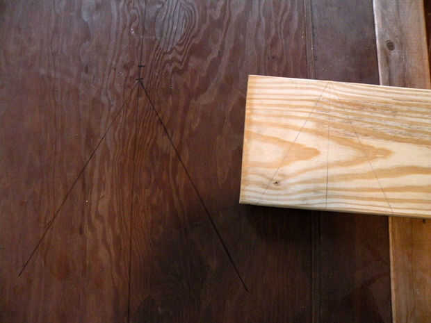 Mantenga una pierna hasta el triángulo con el otro extremo en el aire y ajuste hasta que el pie parece estar más o menos en consonancia con la esquina de la mesa. Puede que necesite un ayudante en esto. Huelga de una línea en la pierna para conseguir la Mitra donde la pierna se une con la tabla. Cortar las piernas a este ángulo. Enroscar y pegar las patas a los triángulos de fijación con tornillos de 3", la perforación para evitar que se resquebraje.