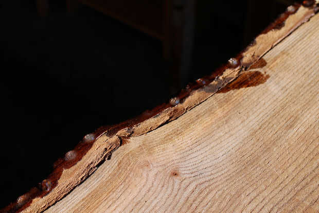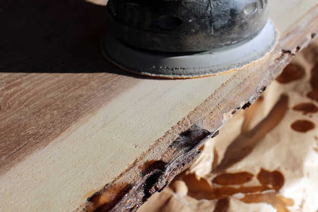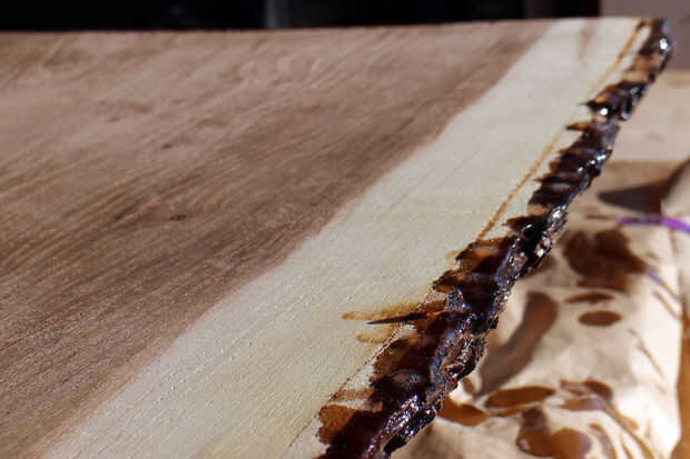 Después de que había curado la resina de la parte inferior la tabla se volcó. Alrededor de los bordes de la evidencia de la mesa era de donde había goteado de resina de la parte inferior, estos fueron limpiados con una lijadora y lija de grano grueso.