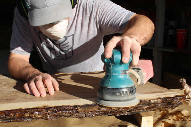 Con una máscara de polvo los bordes eran lijar para eliminar cualquier gota de resina seca, luego lijar con una lija de grano fino para hacer incluso con el resto de la mesa.