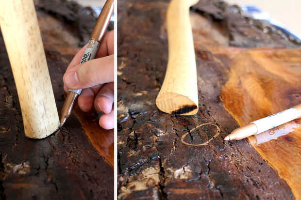 La parte superior del hacha donde había cortado es el ojo del hacha. Trazado este esquema en la parte inferior de la losa de la mesa donde yo quería las piernas colocadas, asegurando incluso la colocación de las 4 patas.