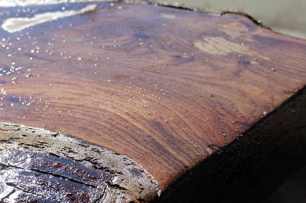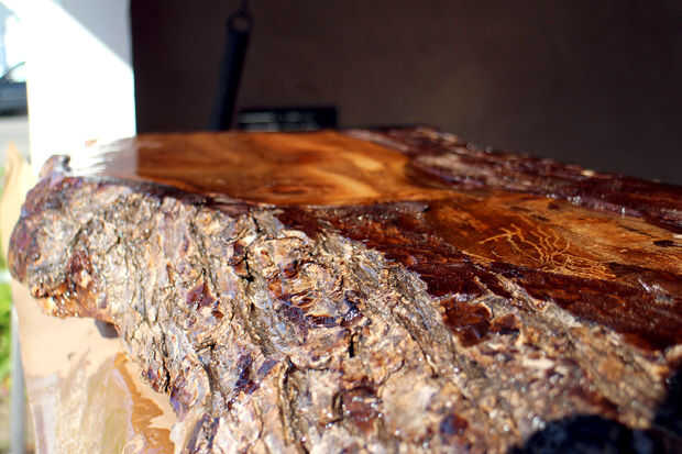 Mezclar un lote grande de resina cubrió las zonas planas primero, luego vierte la resina en todas las grietas de la corteza. La corteza tomó mucho de la resina, por lo que comenzó desde las zonas altas de la parte inferior y deje que gravedad tire la resina hacia abajo y hacia los bordes.
