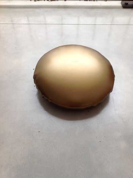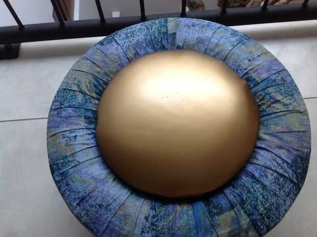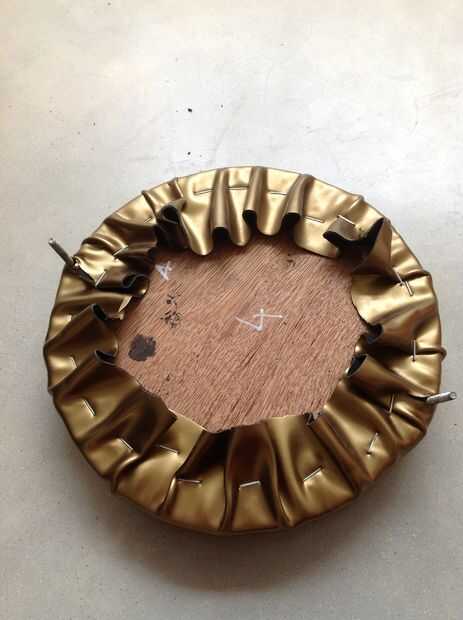 Para cubrir la esponja, tomar un material de algodón, cortar un círculo más grande que la tapa. Difundir el material en el suelo manteniendo la tapa en esa boca abajo hacia el material de la esponja. Tire el paño de algodón en la parte trasera de la tapa y grapas (para hacer bien un tirón firme amortiguador de todos los lados). Del mismo modo utilizar el cuero artificial y lo básico. A diferencia mía, cuero fino sería más fácil de manejar pero no tengo una opción por el color que no he podido encontrar en materiales delgados. Dejar una abertura para los pernos. Ahora nuestra tapa acolchada otomano está lista.
