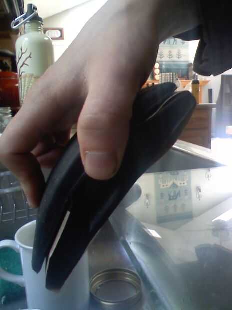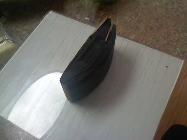 Utilicé papel de grano arena 220 en un bloque de lijado para eliminar los bordes agudos de la rotura. Una piedra de afilar cuchillo hará lo mismo. Tener cuidado para evitar respirar en cualquiera del vidrio!