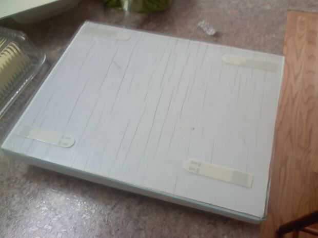 Usaba tiras adhesivas comando para fijar el vidrio a la Junta, pero la cinta espuma serviría igual de bien. Quería un adhesivo que sea simple y perdonando de ligera deformación en el tablero.