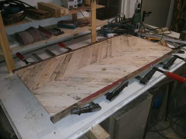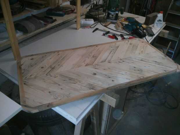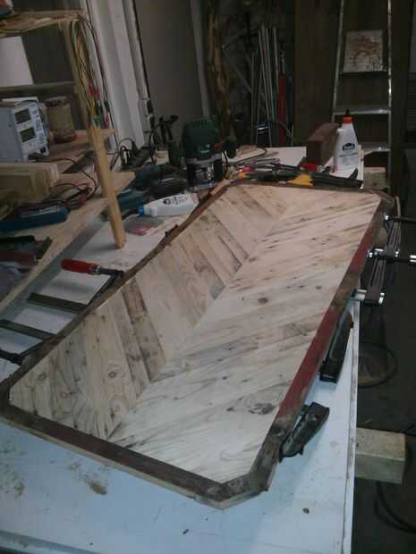 Cortar tiras de la madera de palet. Luego pegados y clavados a la mesa. Ambas bandas en los lados largos sólo fueron pegados y afianzado con abrazadera, sin clavos necesarios.