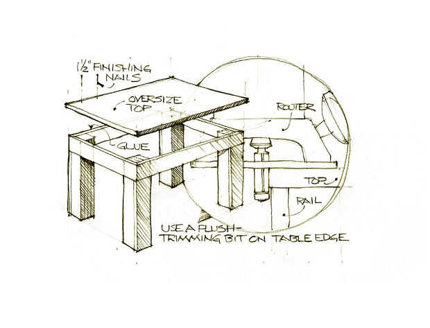 Para la mesa, hemos utilizado un stock MDF 3/4 pulg de espesor. Este material tiene la ventaja de tener una cara del panel liso y uniformemente densos de la base que acepta pintura bien. Cortar la parte superior unos 1/4 pulgadas más largo y más ancho que el marco de la tabla y pegamento y clavo en su lugar hay una proyección uniforme en los bordes. Porque MDF es tan difícil, tendrás que agujerear los agujeros piloto para las uñas. Luego, utilice una broca de recorte al ras a la parte superior los bordes al ras con los rieles de la derrota. Cuando el pegamento se haya secado, establece todas las uñas y rellenar los orificios y cualquier otra imperfección superficial con masilla para madera. La mesa con papel de grano 120 y 220, de la arena y luego cebe y pintar la mesa. Los bordes del panel MDF son más porosos que sea la cara del grupo de la población de álamo, pero el extra capa de primer debe proporcionar una buena base para la capa final de pintura.
