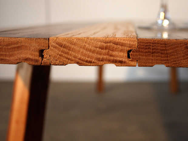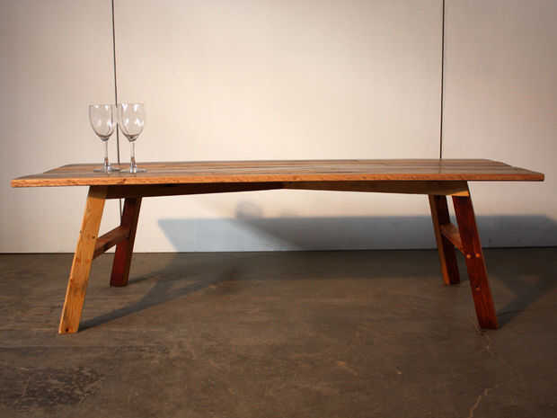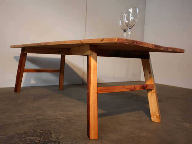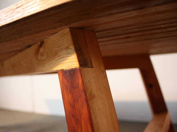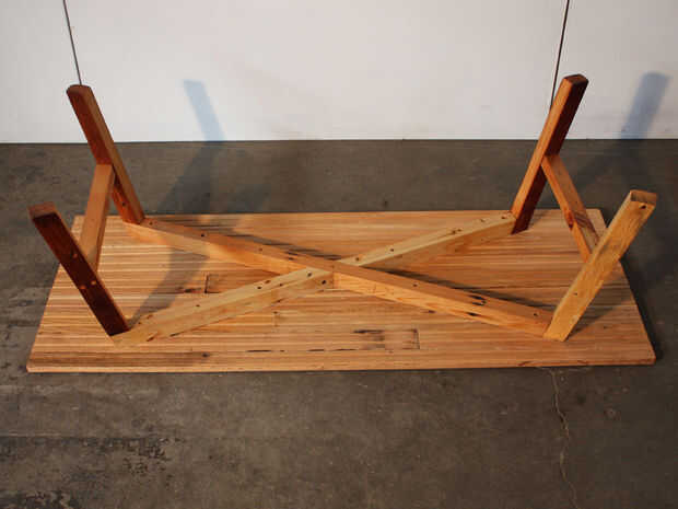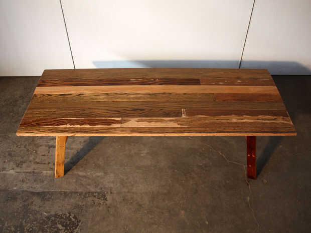 mi piso actual, un edificio, antes de la guerra en Chicago, tiene suelos de madera.  No sé cuántos años son, pero sin duda han tenido muchos años de uso.  Recientemente frente a una pila de suelo de roble recuperado, pusieron dos y dos junto: una mesa de centro que levantó el piso, transponiendo la superficie en una forma nueva.  Los tableros de piso fueron laminados en una pieza sólida, aprovechando la construcción de la lengüeta y el surco, luego montada en una base moderna, en forma de X que ayuda un montón de peso y estabilizar la parte superior.  La parte superior era limpiar y volver a revestido con un resistente de poliuretano, y la base de antiguos fue mano-frotado con aceite de linaza para un acabado brillante y penetrante.  Rápido y ligero, esta tabla reciclada en casa es en concreto o de madera.  Como la madera es recuperada, los materiales costará sólo unos pocos dólares--un poco acabado, unos toques de pegamento y un puñado de tornillos.