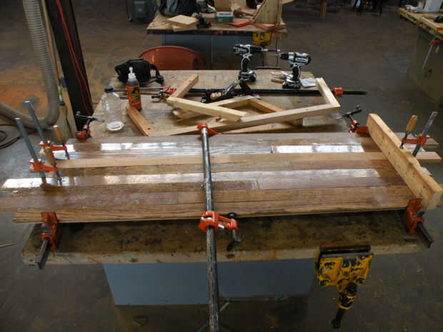 Van sobre la madera con un detector de metales (opcional) y estrecha inspección visual para encontrar cualquier edad uñas puede mantener las tablas de bloqueo juntos.  Colocar las piezas, escalonamiento de cualquier junta de corriente, hasta que haya un arreglo que acabe siendo aproximadamente 48" por 30" (o sin embargo grande mejor ajuste su espacio).  Cada lengua y cada surco con pegamento de la capa y traben libremente, descansando en algunas de las abrazaderas de pipa.  Alternan su arreglo abrazadera por encima y por debajo de los tableros para evitar el pandeo.  Aplicar uniformemente la presión arriba y abajo de la fila de las abrazaderas hasta que todas las juntas estén bien apretadas.  Si la superficie es ondulada, sujete una 2 "x 4" a través de las juntas y al Banco de trabajo para obligarlos plana.  Limpiar pegamento squeeze-out con un trapo húmedo.  Dejar secar 24 horas.