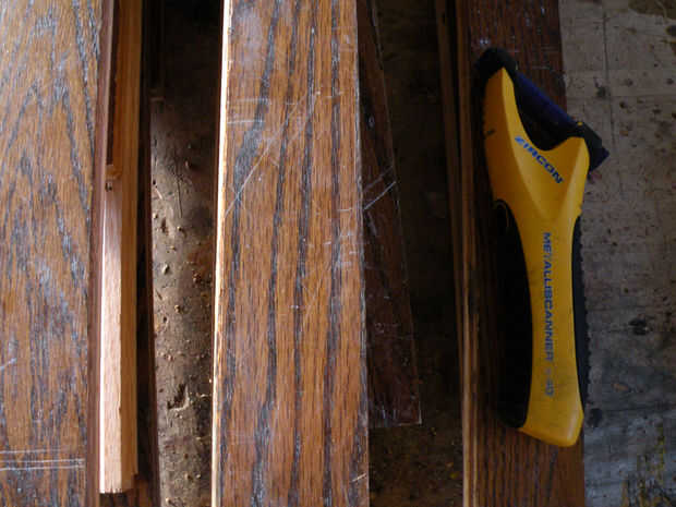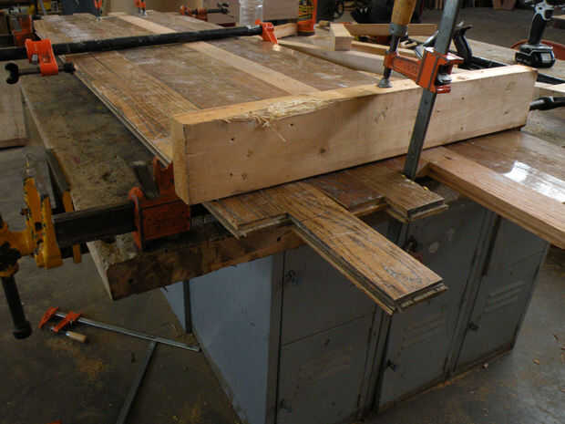 Laminando los tablones juntos demostraron para ser la parte más delicada de todo este proyecto.  Mientras que la configuración de ranura y lengüeta teóricamente agrega fuerza y ayuda con la alineación, en la práctica pondrá en funcionamiento haciendo una superficie plana.  En primer lugar, puesto que es salvado, surcos, las lenguas y el antiguo suelo no interactuan perfectamente uno con el otro ya.  En segundo lugar, como se aplica la presión de sujeción, las lenguas funcionan como bisagras en los surcos, haciendo que la superficie de la hebilla en una onda senoidal.  En el futuro, probablemente sería cortar las lengüetas y ranuras fuera de una tabla vieron y laminado largo grano a grano largo para un fuerte, durable bond y una superficie que sería en posición plana.  Dicho esto, hay algunos trucos para evitar las placas onduladas, y el arreglo de la lengüeta y el surco probablemente contribuirá positivamente a la fuerza a largo plazo.