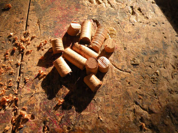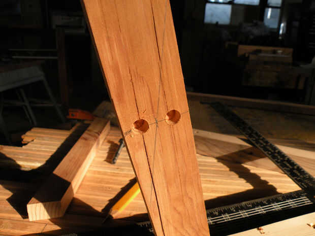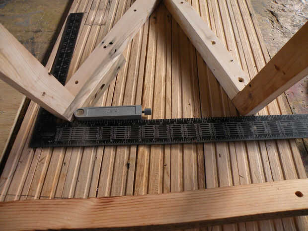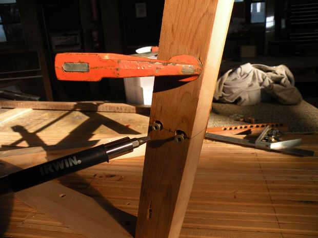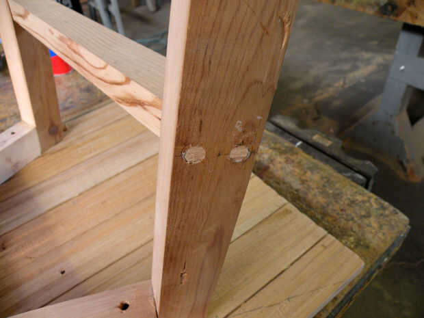 Para apoyo de las piernas, coloque un borde recto a través de ellas, entonces use un buscador de ángulo como se muestra. El ángulo de transferencia a la tronzadora y cortar una llave para cada lado. Encolar y atornillar a medio camino abajo de las piernas. Yo había hundida los tornillos y luego utiliza un cortador de enchufe para hacer tapones de espiga para cubrir las cabezas de los tornillos. Este paso es opcional, pero agrega a la apariencia final. Carece de un cortador del enchufe, utilice clavijas fabricadas, pero ten en cuenta que el color y el grano partido probablemente estará apagado.
