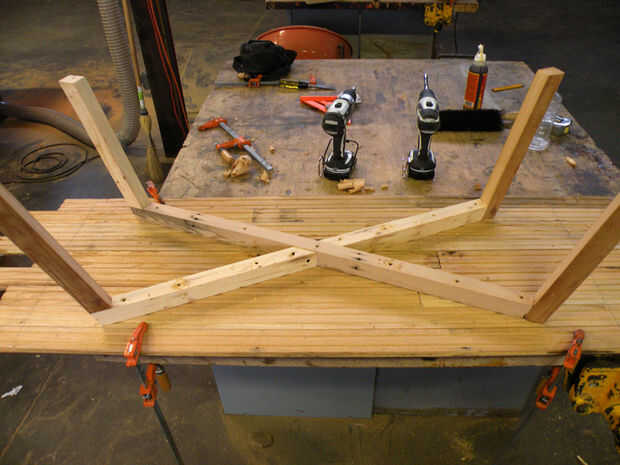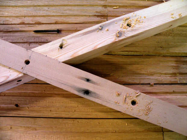 Como se puede ver en la foto, los extremos de los pisos de rienda--será recortarlo después. Encontrar un centro de áspero y alinee la X por lo que atraviesa cada tablero de piso. Avellanar, Pretaladre y atornille la X en cada junta. Golpear cada junta es crucial; Esto asegurará la estabilidad en el largo plazo, manteniendo la mesa superior de torcer y bucking demasiado con la humedad y la temperatura cambia con el tiempo.