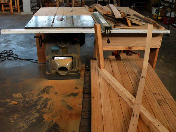 Ahora que está sujeta la parte superior y robusto, recorren toda la tabla de la mesa de sierra para cortar las lenguas y las ranuras de los bordes laterales y aun hasta los bordes cortos. Utilizar un trineo para hacer los cortes transversales. Esto también puede ser realizado con una sierra circular, sólo asegúrese de que a una junta para que sus cortes son rectos.