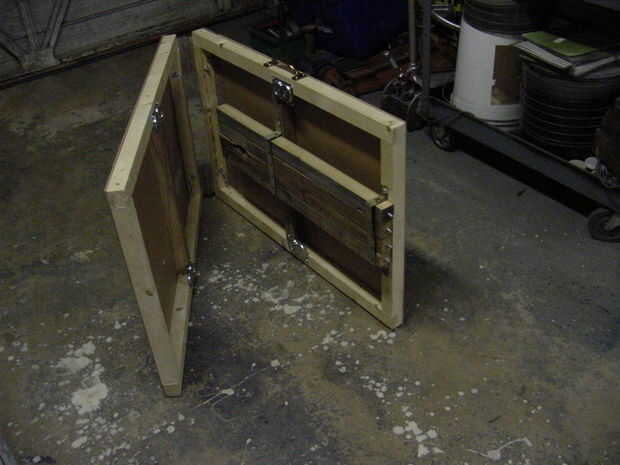 En su mayor parte se termina el proyecto. Observe la posición de los montajes de la pierna. Las piernas se almacenan utilizando straping metal doblado a la forma. Manija para llevar. Tabla material superficial puede ser tan bonito o tan barato como quieras. Tengo ocuparse varias hojas de cartulina pegada con cemento de contacto y recubierta de tela o vinilo. De aquí la esencia y el tablero marcador tiempo se hizo una buena opción.