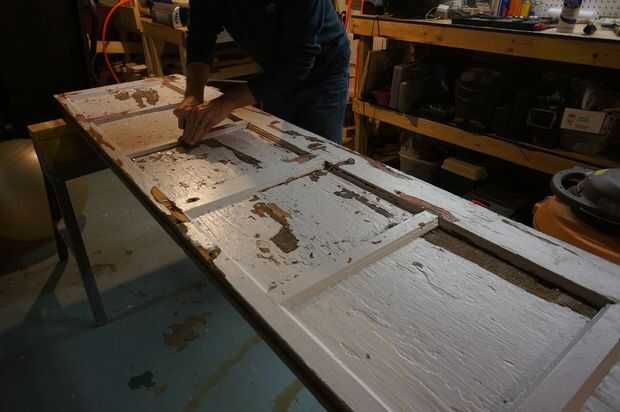 Empecé por intentar raspar la pintura de las puertas.  Esto resultó para ser muy difícil ya que hay aproximadamente 60 años de pintura pegada a la puerta.  Ya que yo no estaba usando del lado pintado de la puerta de la parte superior, no pasé mucho tiempo intentando quitar la pintura.  Básicamente quería asegurarse de que no tengo chips de pintura suelta, viene de la parte inferior de la tabla. (Nota * - quiero señalar que no tengo ni idea si la pintura de estas puertas era con base de plomo.  Me aseguré que cualquier pintura que pueda estar pelado, seleccionado o derribado fue quitado y arena suave.  Cualquier superficie pintada sin sellar no estaría expuesta a alimentos y estaría fuera del alcance de curiosos las manos.  Por favor, Téngalo en cuenta cuando se trabaja con mayores pintados materiales.)