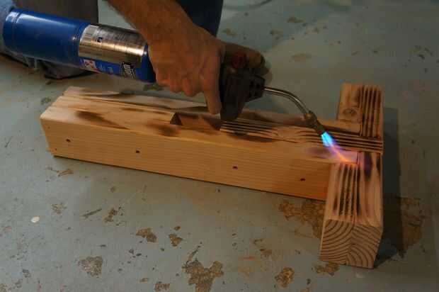 - Barra cuidadosamente una antorcha sobre la madera permitiendo que la llama quemar la madera. No quiero quemar la madera a cenizas, a char los granos externos a un bonito marrón oscuro/negro. Variado la cantidad de carbonización sobre la madera para darle cierta variedad.