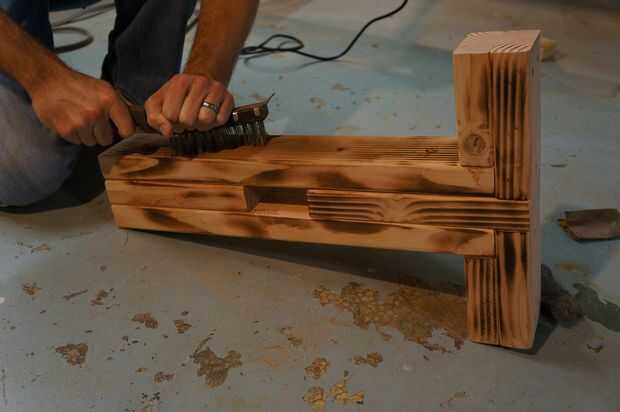 - Una vez que tenga un grado de ennegrecimiento es feliz con, toma un cepillo de alambre y fregado de la madera carbonizada. Cuanto más usted quemar más material que elimina. La llama quema la parte más suave del grano y apenas toca las partes más difíciles.