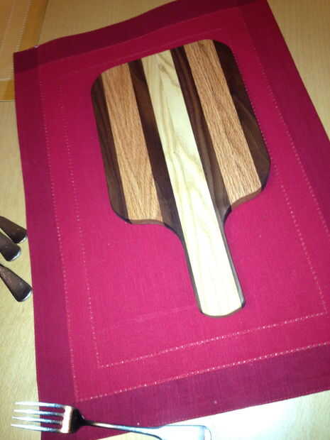 cortar 10 piezas, aproximadamente 18 pulgadas largo de piezas de roble, arce y nogal.  Les pegué con pegamento de madera de carpintero de Elmer, con 5 campos y se dejó secar durante varios días. A continuación, usé un cepillo para hacer incluso la madera y quitar el exceso de cola que se había secado encima de la madera. Entonces lija lo un poco por lo que sería suave para el calcado sobre el patrón de la manija del tablero.  Me corte con una sierra de calar y luego lijar los bordes con una lijadora eléctrica.  Tras el primer lijado, puse agua por todas partes para elevar el grano y luego lijar otra vez el siguiente día cuando se seca.  Levanté el grano dos veces y lija en una última vez antes de la tinción con aceite mineral.  Puesto que la meta es servir comida deliciosa, como queso y galletas, no puede ser cualquier tipo de aceite tóxico.  Varias capas de aceite mineral durante un par de días y estaba listo para ir!