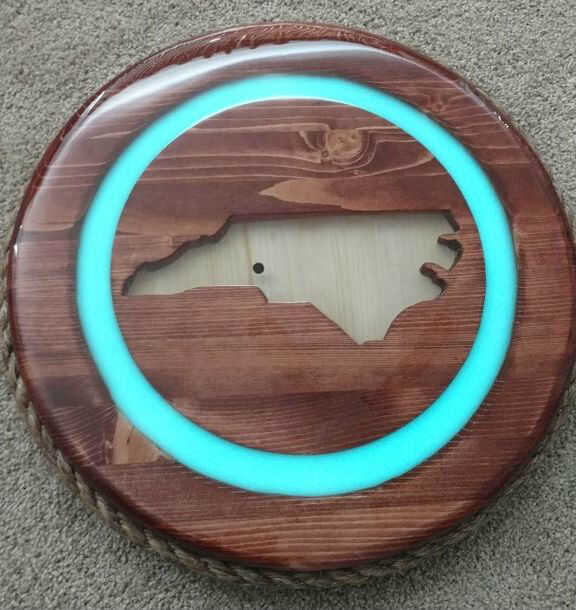 Hice un epoxy resina mesa llena y añade un brillo en la función de oscurezca para que sea realmente única. Fácilmente puede personalizar mi diseño con cualquier forma simple como el punto focal para su mesa. Soy un residente del bello estado de Carolina del norte, así que elegí mi forma de estado como el punto focal. Esta tabla es muy económica hacer con las piezas más costosas son la resina de epoxy de dos partes y el polvo brilla en la oscuridad.