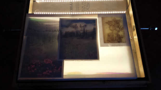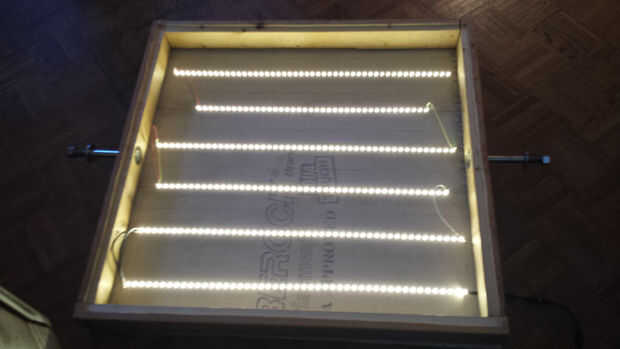 (Por cierto una hoja de vitela o papel de calco puede también ayudar a difundir la luz si no tienes tiempo para chorro de arena del vidrio. O puede utilizar una hoja de acrílico o plástico opaco. Que es mejor para la fuerza estructural, seguimiento y durabilidad que una ventana de vidrio. Pero este fue el reto de la tabla de seguimiento de ghettofabulous en cuanto a trabajar con lo que tenía en mano.)
