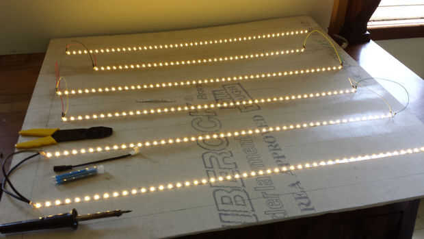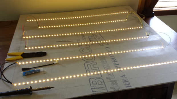 Ahora los cables de salto y la soldadura tus leds juntos. Asegúrese de que cuando se establecen y adherir las tiras de LED que cada tira está en la posición correcta para soldar y eso salto de cables de la longitud adecuada para permitir la facilidad de soldadura, así. Utilice una pistola de pegamento caliente para sellar sus soldaduras más longevidad.