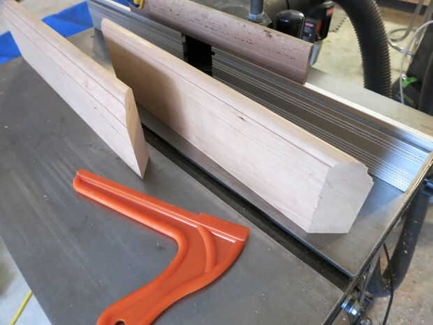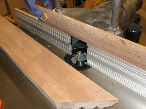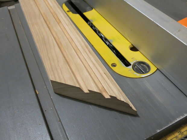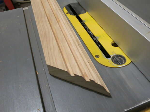 La canasta de monedas siguieron el mismo estilo de diseño. Cortar un trozo más grueso del material correspondiente al ajuste entre los triángulos y contornee el borde delantero con un perfil similar. Utilice un disco de moldurar o varias pasadas en una mesa de sierra para cortar muescas de 1-3 1/4" densamente en 30-45 grados. Para un sostenedor de la moneda normal de escritorio un tono superficial está muy bien pero ya que estos serán vistos desde arriba, un ángulo más escarpado es más apropiado.