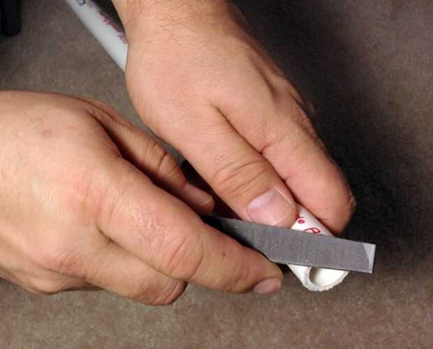 La corte deja un poco de un labio deformado después de cortar, para que los bordes biselados todo apagado con un archivo. Este es un paso esencial porque la portabilidad de la mesa depende de las piezas de ajuste de deslizamiento juntos. El bisel asegura que los tubos van dentro y fuera de las articulaciones fácilmente.